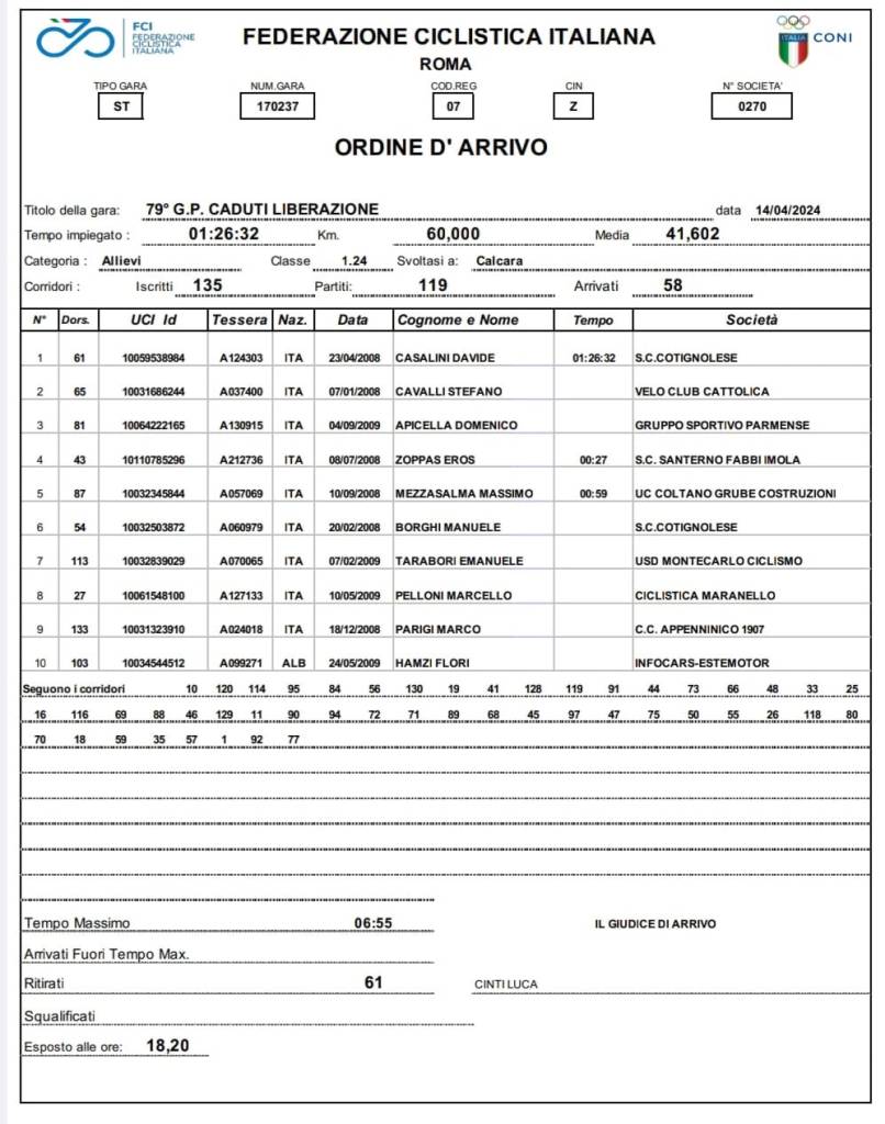 Tra i pochi arrivati anche Lorenzo Immovilli e Luca Cavatorta, quest’ultimo ha corso sempre in buona posizione ma non è riuscito ad entrare nella fuga di quattro corridori che è arrivata al traguardo con 50″ sul gruppo.
