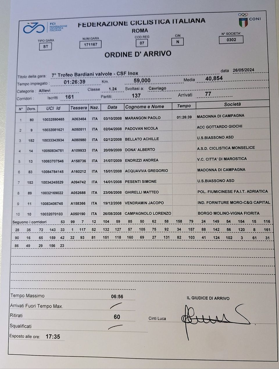 Ben 137 partenti di cui 77 al traguardo, 59 km percorsi a 40,8 km/h.