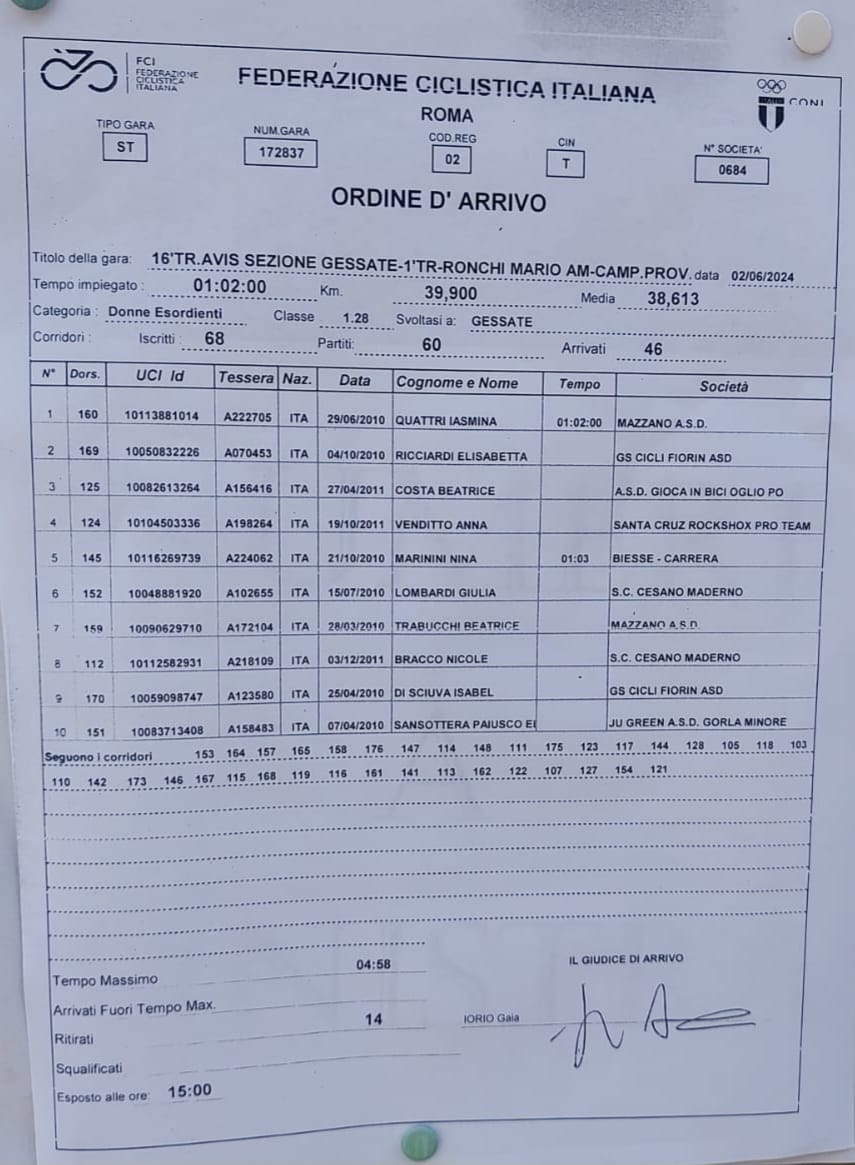 Giulia Trombin ha preso parte e concluso il 16° Trofeo Avis di Gessate, 60 atleti partenti di cui 46 arrivate al traguardo, 39,5 km percorsi a 38km/h dalle 4 fuggitive arrivate con 1′ di vantaggio sul gruppo principale.