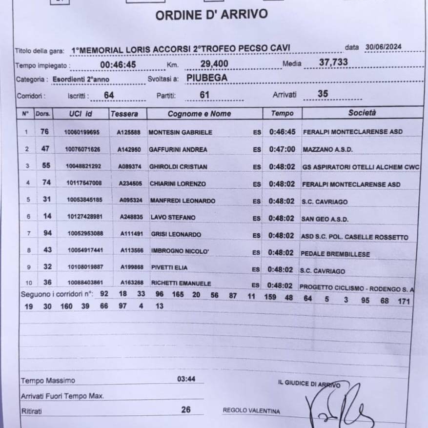 In volata Manfredi si trova sul lato della strada non vincente, è 6° assoluto e 5° della sua categoria, bene anche Pivetti 11° assoluto e 9° tra i secondi anno.