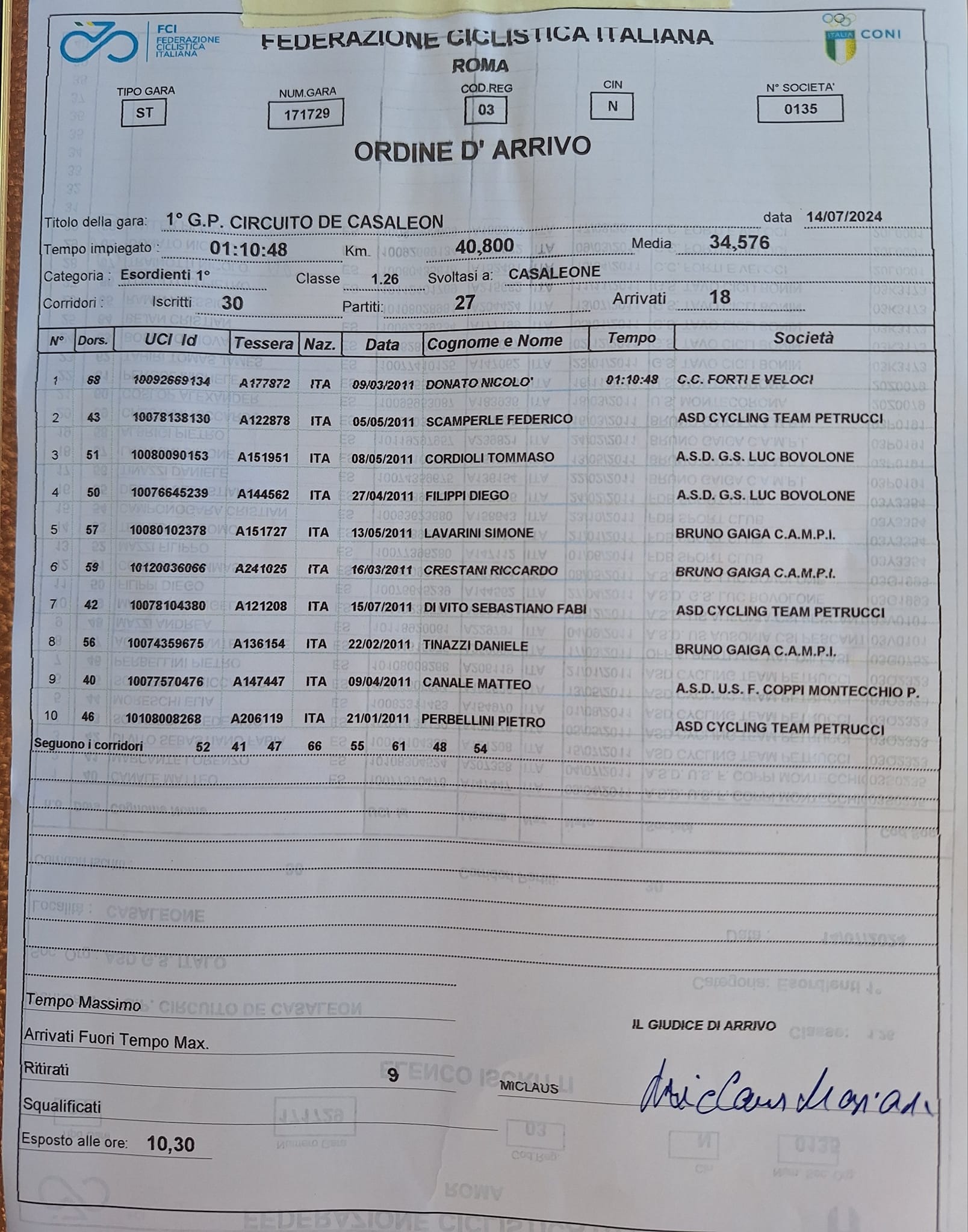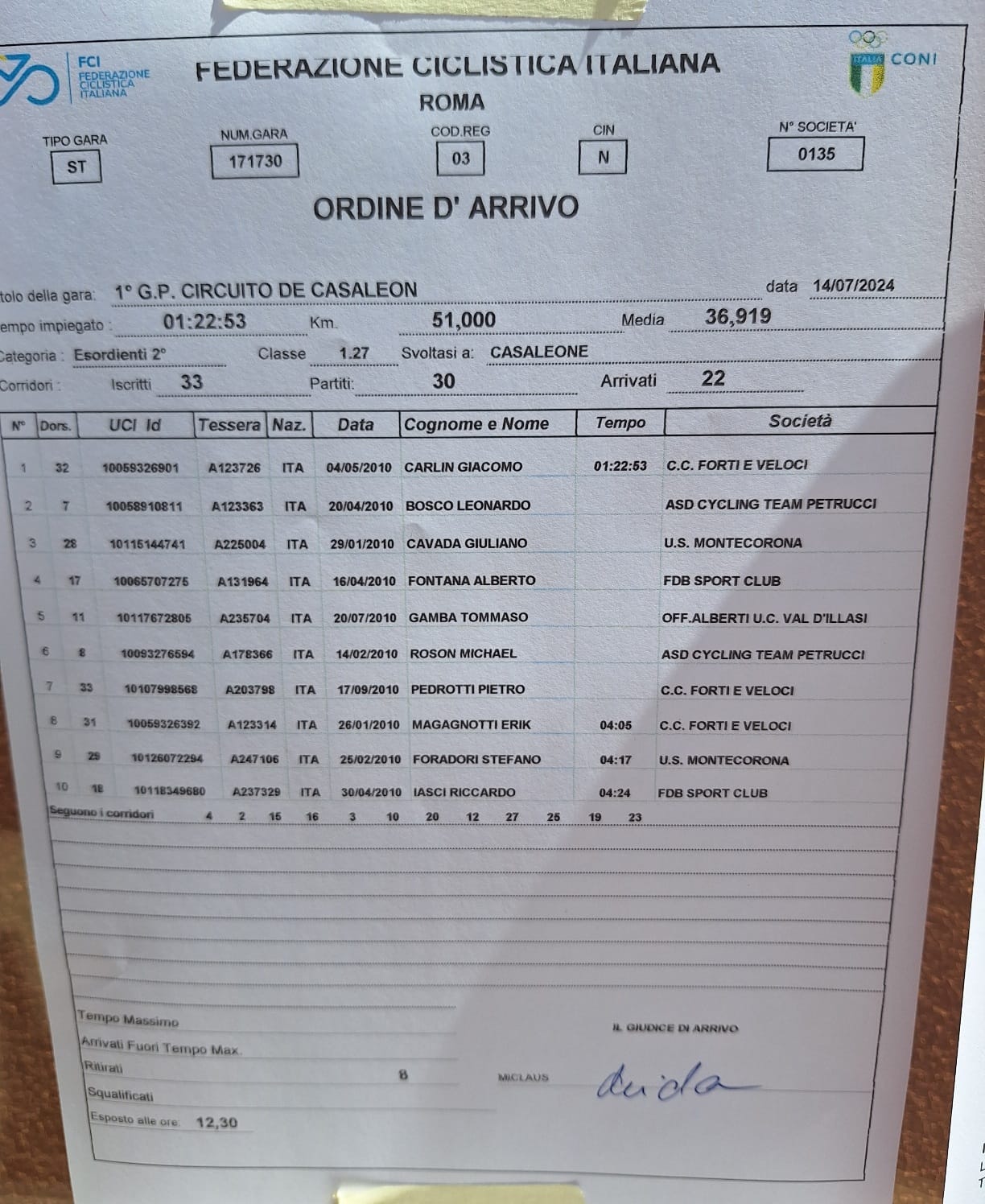 Nella gara dei classe 2010 è arrivata al traguardo la fuga di un gruppetto di 7 atleti, evasi al 3° di 10 giri, poi regolati in volata da Carlin, anche lui della Forti e Veloci. Tra i fuggitivi ed il gruppo principale, Magagnotti ha dovuto farsi ben 30 km da solo per guadagnarsi l’8° posizione.