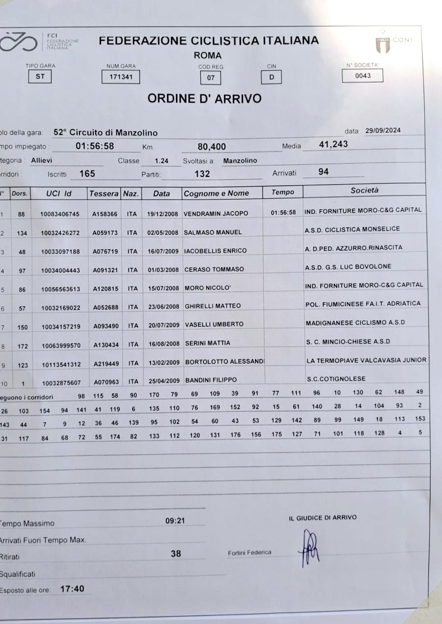 132 partenti provenienti dall’Emilia Romagna, dal Veneto e dalla Lombardia hanno affrontato il circuito pianeggiante di Manzolino, per un totale di 79 km percorsi a 42 km/h.