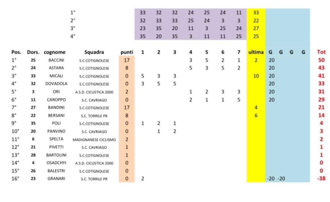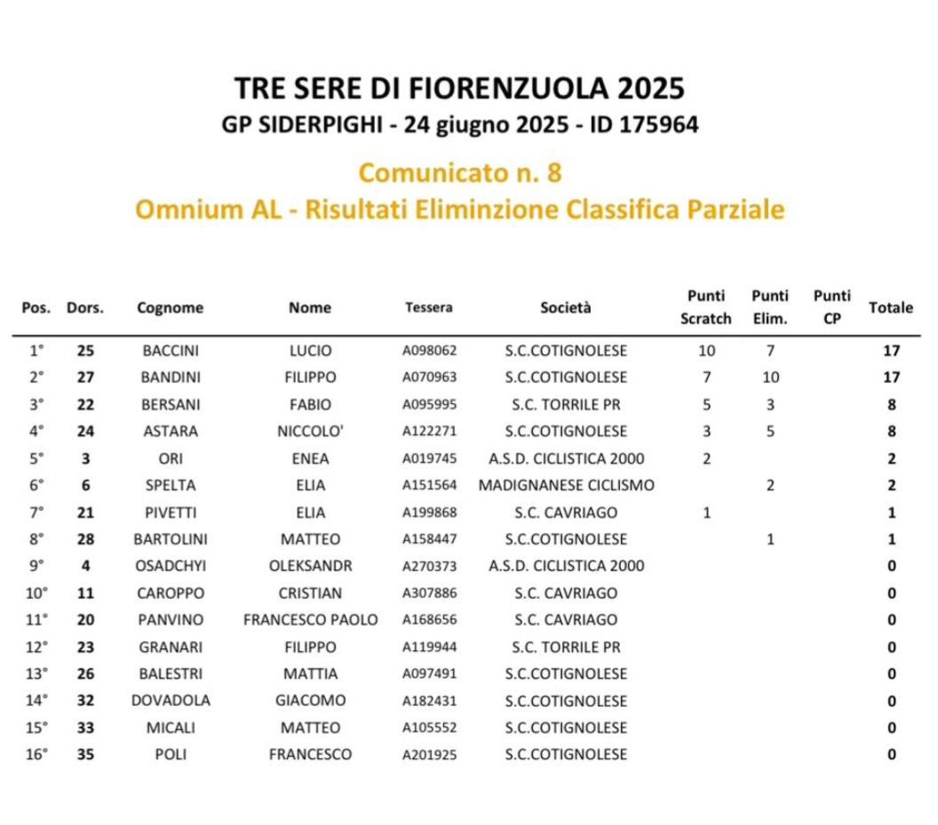 Anche nell’Eliminazione c’è stato un dominio della Cotignolese, ma a posizioni invertite: 1° Bandini, 2° Baccini, 3° Astara, 4° Bersani.