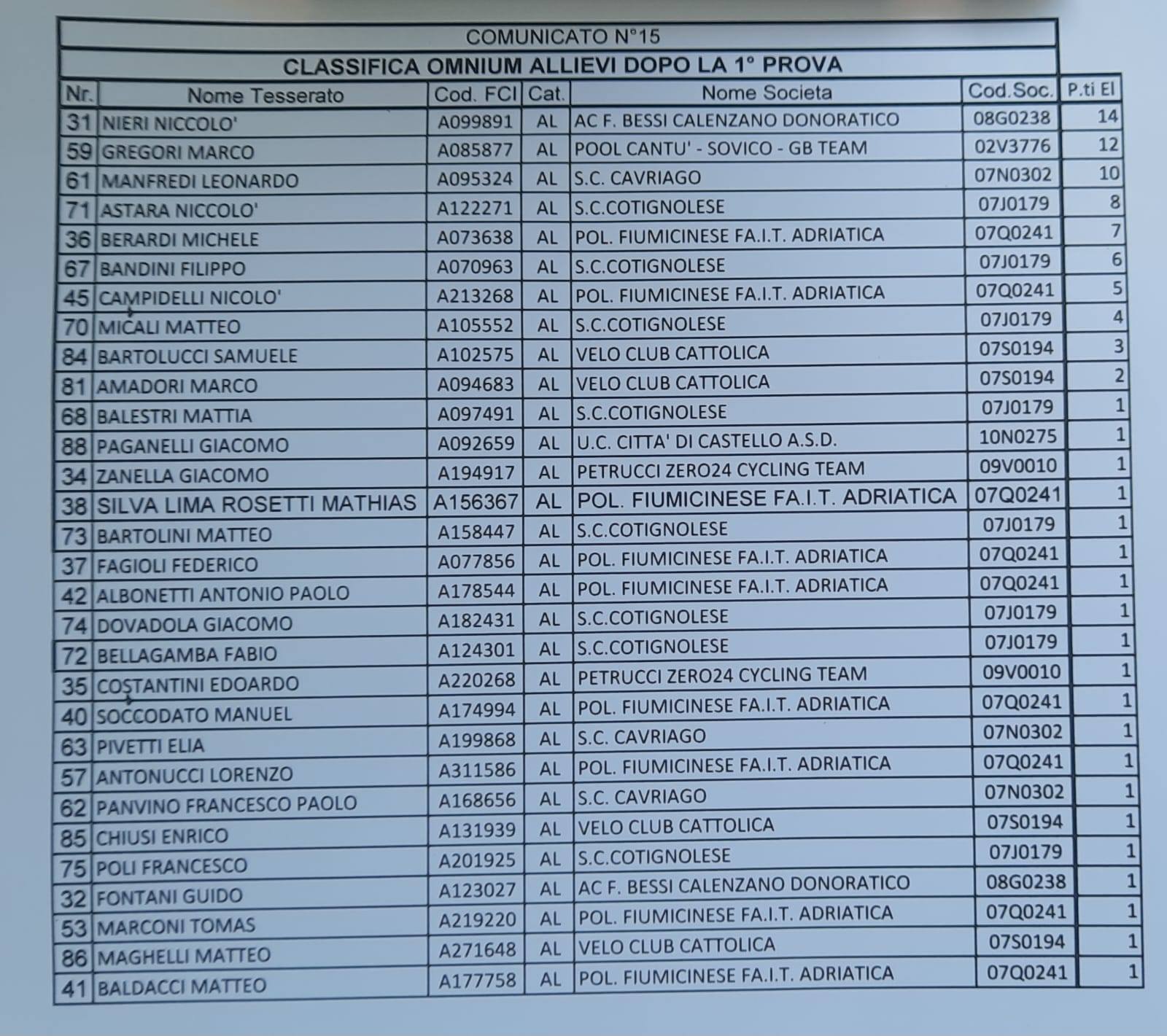 Al termine della seconda prova, la CORSA A PUNTI di 30 giri e 6 volate, ci sono state le conferme di Nieri e di Gregori nello stesso ordine, 3° Bandini della Cotignolese, 6° Manfredi, sceso di posizioni avendo raccolto pochi punti nonostante una gara all’attacco.