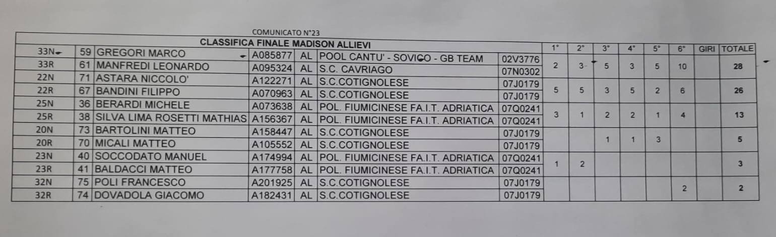 I migliori pistard di Emilia Romagna, Toscana e Marche si sono dati appuntamento a Forlì, ben 37 gli Allievi in gara nell’Omnium e successivamente 6 coppie nella Madison vinta da Leonardo Manfredi insieme a Marco Gregori del GB Team Pool Cantù. Per Manfredi 3° vittoria in pista nella stessa settimana.