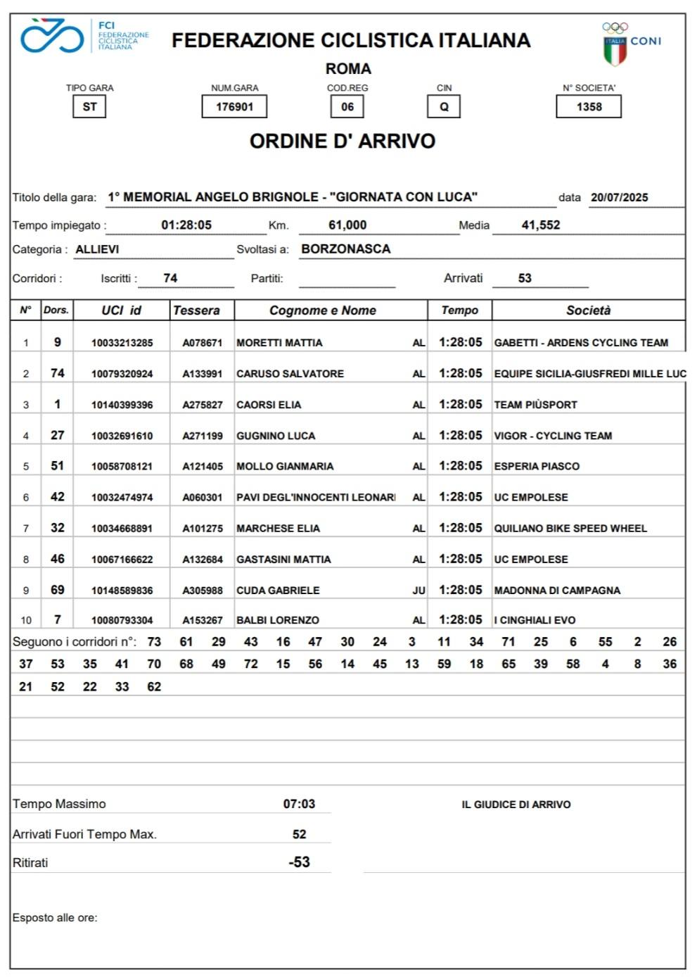 Complessivamente 74 partenti, 53 dei quali sono riusciti a tagliare il traguardo.