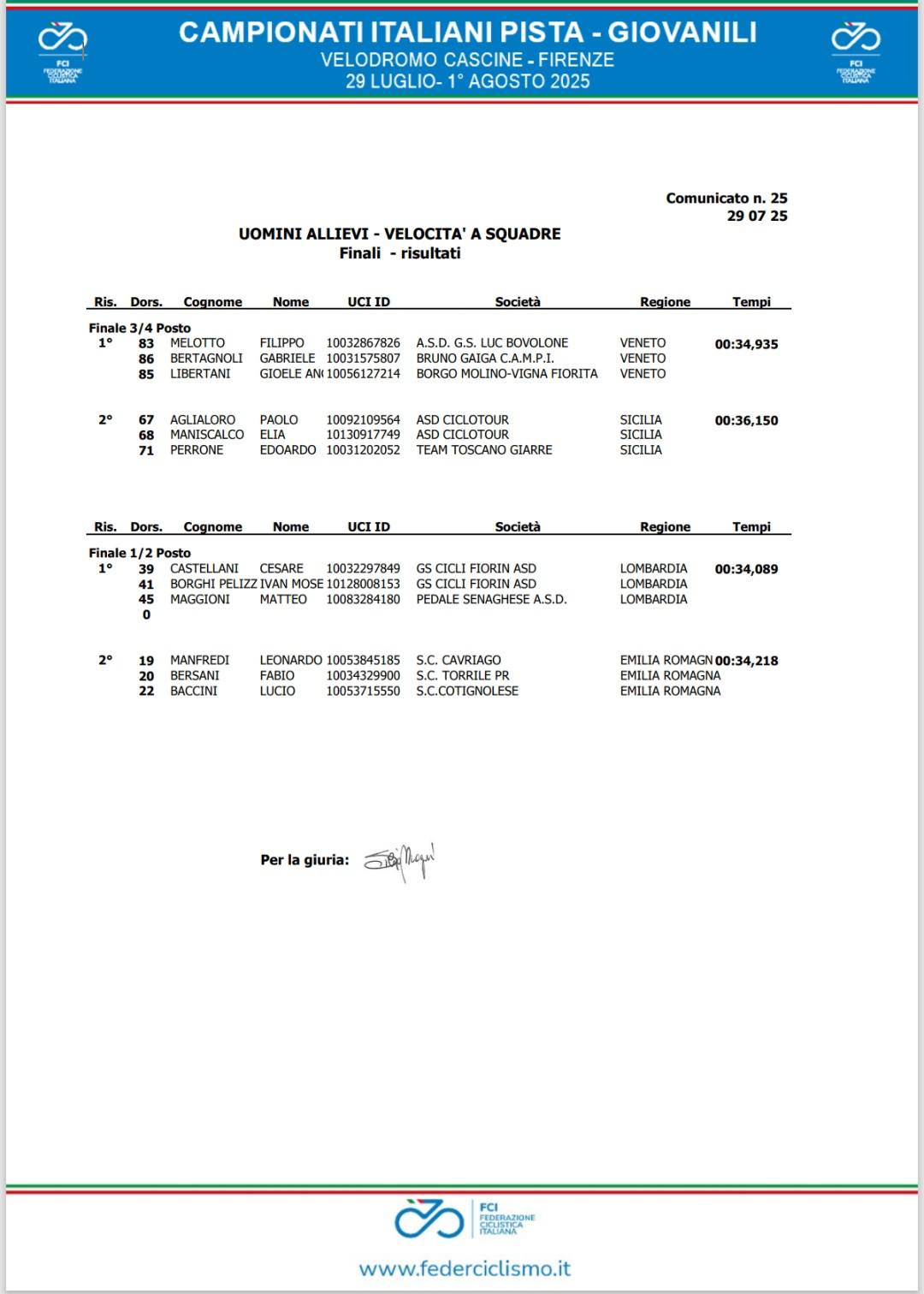 Giusto il tempo della premiazione e poi sotto con la finale per il terzo posto nell’inseguimento a squadre contro il FriuliVeneziaGiulia. Il nostro quartetto viene leggermente rivisto: Manfredi, Gregori, Bandini ed Astara al posto di Baccini. In svantaggio nei primi giri, Manfredi recupera il gap prima di terminare il proprio lavoro da quarto, poi il vantaggio cresce e la conquista della medaglia di bronzo è netta con 3′ 34″,45 contro 3′ 36″,88.