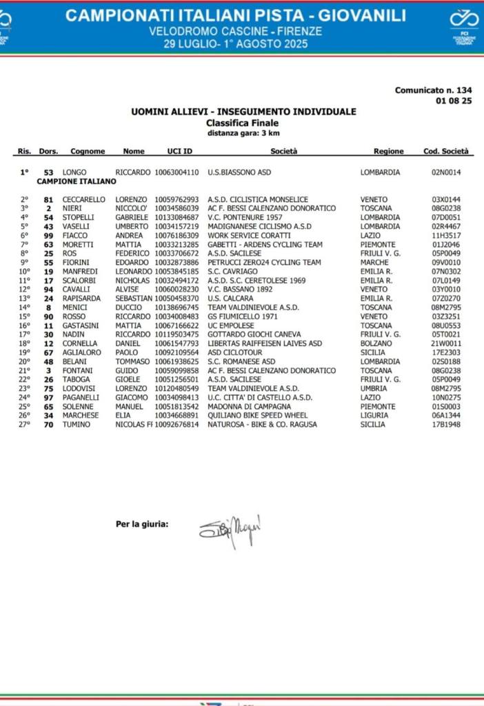 Leonardo Manfredi, impegnato nell’inseguimento individuale, ha ottenuto il 10° posto con il tempo di 3’47”,222, terzo miglior tempo tra gli allievi primo anno, alle spalle di Longo e Fiacco.