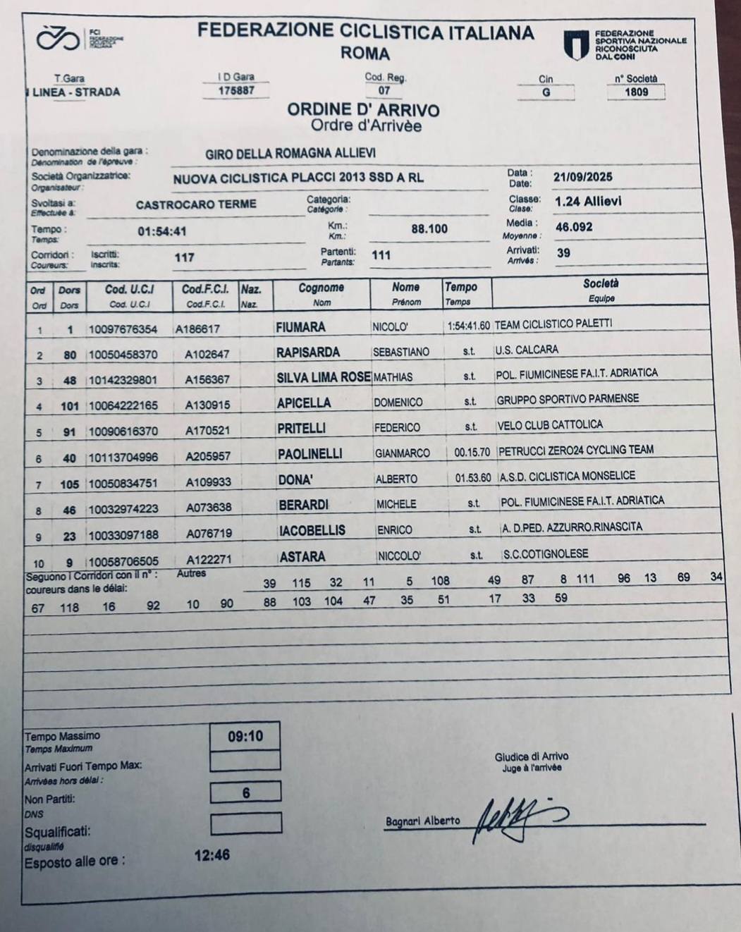 Gara caratterizzata da tante cadute e tante forature, gli unici sopravvissuti della Cavriago ad arrivare al traguardo in gruppo sono stati Cristian Caroppo e Guatteri.