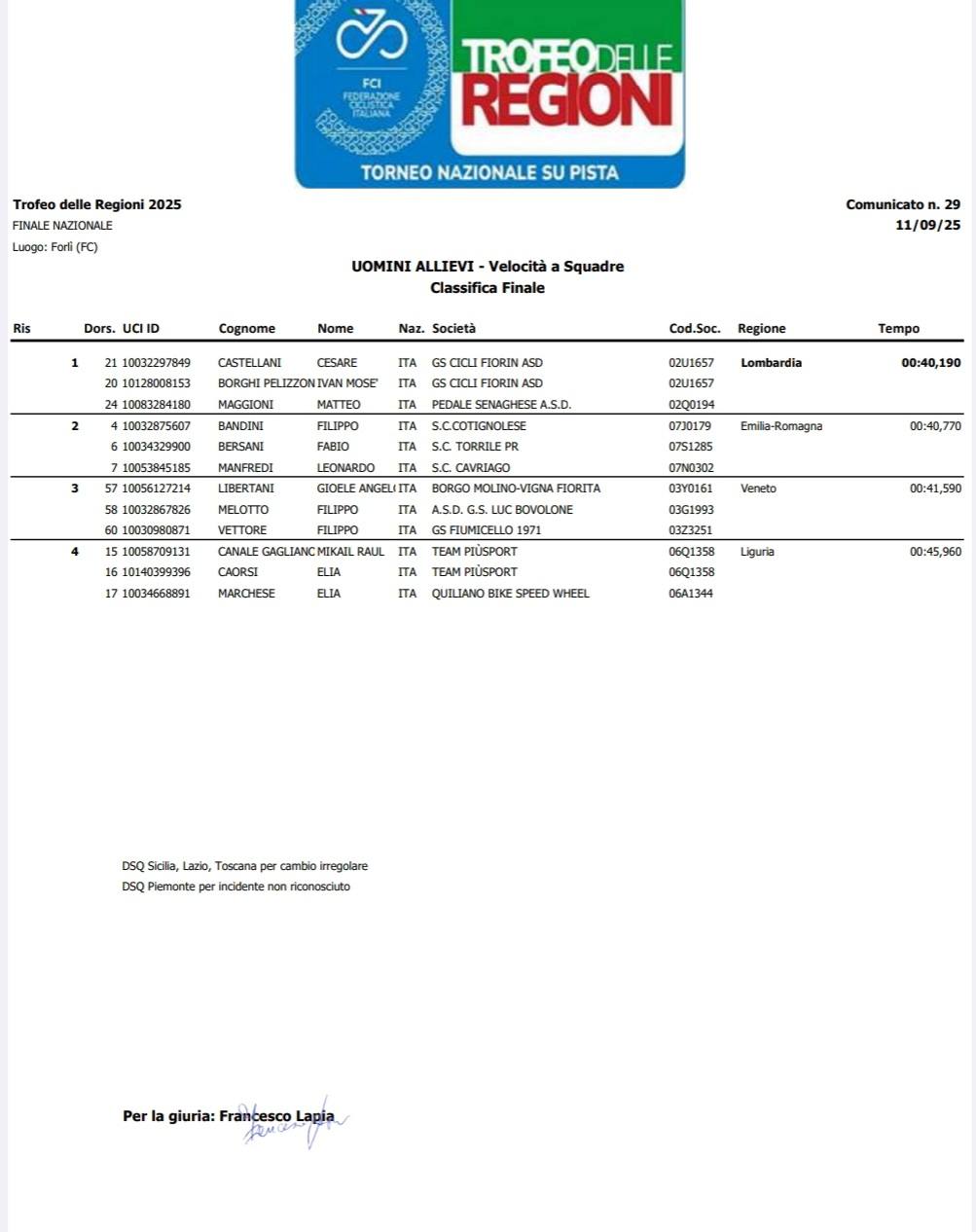 ALLIEVI – FINALE TROFEO DELLE REGIONI, Forlì, 11.09.2025